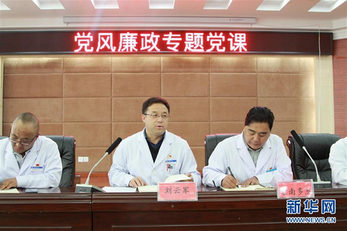 這是來自北京的援青干部劉云軍(中)在黨風廉政專題黨課上(資料照片)。新華社發(fā)
