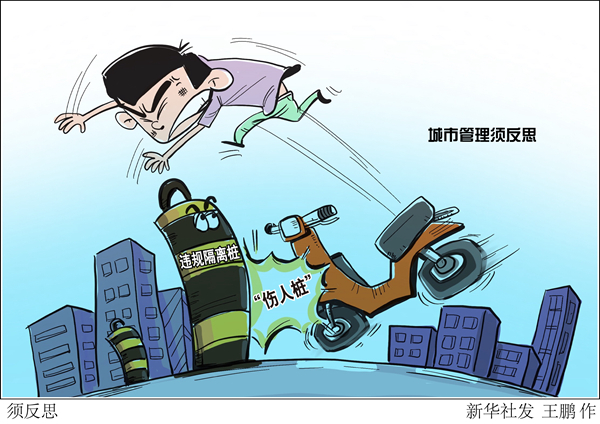 漫畫:須反思 近日,一位鄭州市民騎電動(dòng)車撞上隔離樁受傷,經(jīng)搶救無效死亡。記者在鄭州采訪了解到,醫(yī)院曾接診過很多撞隔離樁的受傷者,有的破皮流血,有的刺穿腳掌,有的摔斷腿骨。隔離樁變“傷人樁”警示城市管理不能任性粗放,應(yīng)堅(jiān)持以人為本,要像繡花一樣精細(xì),否則害民不淺。新華社發(fā) 王鵬 作
