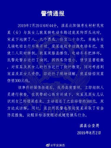 根據(jù)淇縣公安局官方微博發(fā)布的通報(bào),7月29日6時(shí)44分,淇縣北陽(yáng)鎮(zhèn)棗生村村民宋某(女)與其女兒耿某騎電動(dòng)車(chē)路過(guò)龐某的西瓜地時(shí),宋某下地摘了八、九個(gè)西瓜,價(jià)值二十余元。當(dāng)她與女兒騎電動(dòng)自行車(chē)離開(kāi)時(shí),龐某追趕中拉拽電動(dòng)車(chē)把,致使三人同時(shí)摔倒。耿某雙膝蓋擦傷,電動(dòng)車(chē)車(chē)把摔壞。民警出警后進(jìn)行了詢問(wèn),因西瓜價(jià)值小,情節(jié)顯著輕微,對(duì)宋某及其女兒的行為進(jìn)行了批評(píng)教育。同時(shí)考慮到宋某及其女兒受傷,即進(jìn)行了現(xiàn)場(chǎng)調(diào)解,龐某賠償宋某傷情300元。