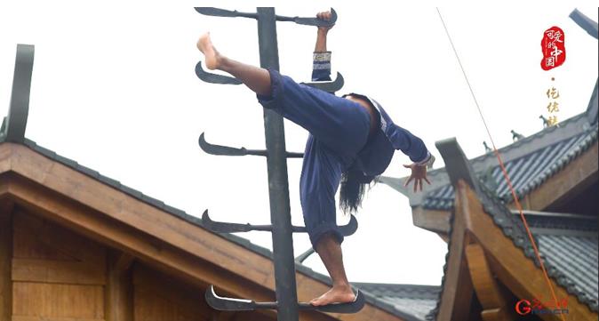 在仡佬族儺戲當(dāng)中,還有一種不可缺少的民間儀式,就是上刀梯。踩著鋒利的刀梯向上攀行、一雙赤腳卻毫發(fā)無損。這也是仡佬族人們祈福孩子平安順利成長的一種方式。