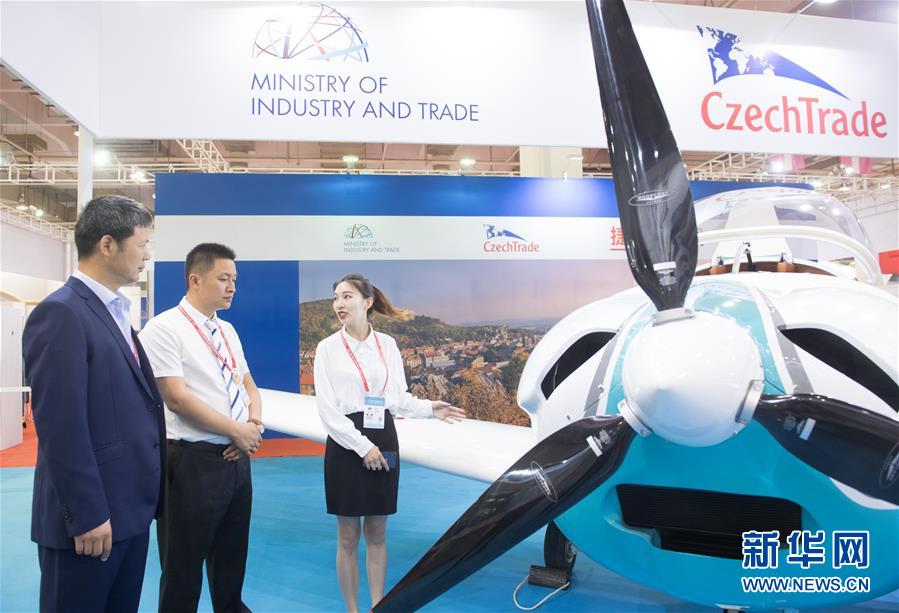 6月8日,在浙江寧波舉行的首屆中國-中東歐國家博覽會上,一名展商(右)在介紹捷克生產的一款輕型飛機。新華社記者 翁忻旸 攝