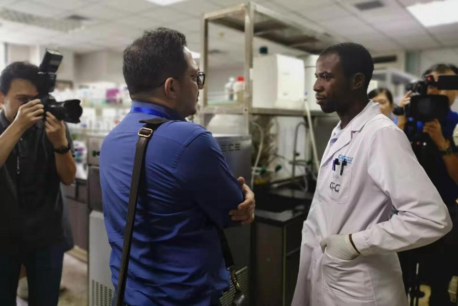 來自喀麥隆的阿諾德(右一)在病原微生物與免疫學(xué)重點實驗室從事博士后研究,他在向外國媒體記者介紹自己的工作。(王曉亮攝)
