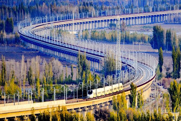 蘭新高鐵動(dòng)車組列車在新疆哈密特大橋上行駛 (蔡增樂(lè) 攝)