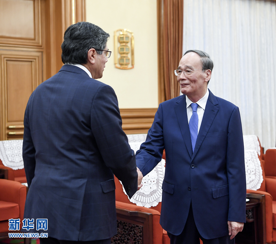 11月1日,國(guó)家副主席王岐山在北京中南海會(huì)見(jiàn)厄瓜多爾外長(zhǎng)瓦倫西亞。 新華社記者 張領(lǐng) 攝