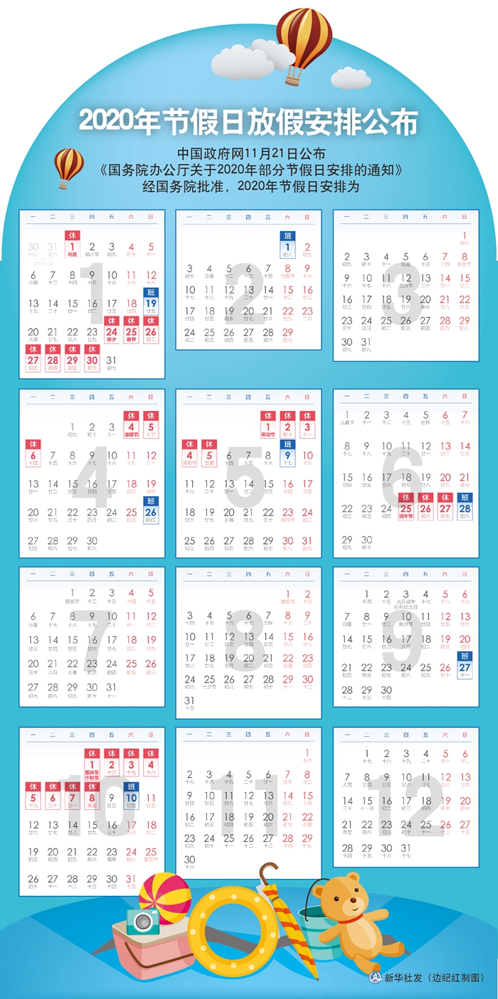 新華社北京11月21日電(記者安蓓)中國(guó)政府網(wǎng)21日公布《國(guó)務(wù)院辦公廳關(guān)于2020年部分節(jié)假日安排的通知》,經(jīng)國(guó)務(wù)院批準(zhǔn),2020年節(jié)假日安排為:元旦1月1日放假,共1天;春節(jié)1月24日至30日放假調(diào)休,共7天,1月19日(星期日)、2月1日(星期六)上班;清明節(jié)4月4日至6日放假調(diào)休,共3天;勞動(dòng)節(jié)5月1日至5日放假調(diào)休,共5天,4月26日(星期日)、5月9日(星期六)上班;端午節(jié)6月25日至27日放假調(diào)休,共3天,6月28日(星期日)上班;國(guó)慶節(jié)、中秋節(jié)10月1日至8日放假調(diào)休,共8天,9月27日(星期日)、10月10日(星期六)上班。