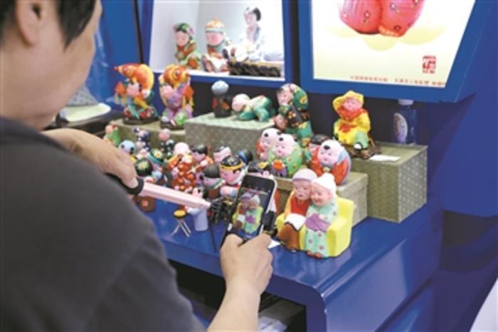 第十四屆中國(guó)北京國(guó)際文化創(chuàng)意產(chǎn)業(yè)博覽會(huì)現(xiàn)場(chǎng),觀眾拿起手機(jī)拍攝“中國(guó)夢(mèng)”泥塑創(chuàng)作者天津泥人張彩塑作品。本報(bào)記者 劉金夢(mèng) 攝