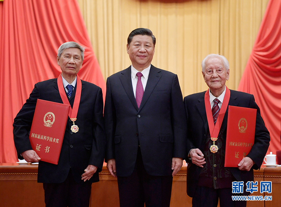 1月10日,2019年度國家科學(xué)技術(shù)獎勵大會在北京人民大會堂隆重舉行。中共中央總書記、國家主席、中央軍委主席習(xí)近平向獲得2019年度國家最高科學(xué)技術(shù)獎的原中國船舶重工集團公司第七一九研究所黃旭華院士(右)和中國科學(xué)院大氣物理研究所曾慶存院士(左)頒獎。 新華社記者 謝環(huán)馳 攝