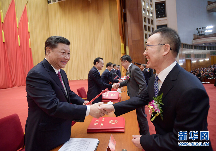 1月10日,2019年度國家科學(xué)技術(shù)獎勵大會在北京人民大會堂隆重舉行。這是中共中央總書記、國家主席、中央軍委主席習(xí)近平向獲獎代表頒發(fā)證書。 新華社發(fā)(盛佳鵬 攝)