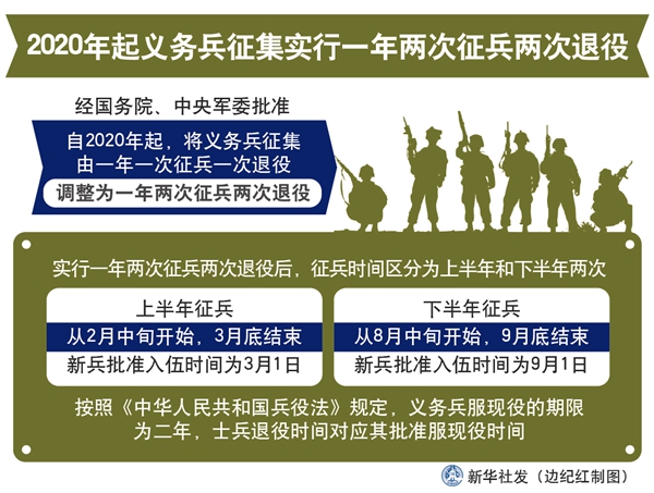新華社北京1月16日電(記者賈啟龍)經(jīng)國務(wù)院、中央軍委批準,自2020年起,將義務(wù)兵征集由一年一次征兵一次退役,調(diào)整為一年兩次征兵兩次退役。