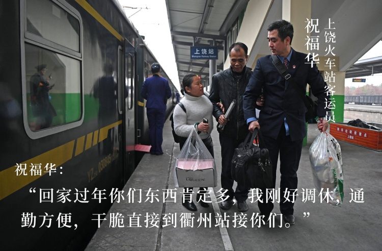 祝福華是上饒火車(chē)站的一名客運(yùn)員,經(jīng)常在車(chē)站碰到他們,每次都熱心地幫忙提行李,護(hù)送進(jìn)出站,日子久了就互相留了電話和微信以方便聯(lián)系。只要魯師傅夫婦有需要,即便沒(méi)在班上,祝福華也會(huì)趕到車(chē)站幫助他們。