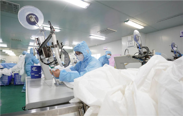 1月28日,在武漢市新洲區(qū)武漢協(xié)卓衛(wèi)生用品有限公司,工人在趕制防護(hù)服,該公司是生產(chǎn)手術(shù)服、防護(hù)服等產(chǎn)品的企業(yè)。 新華社記者 才揚 攝