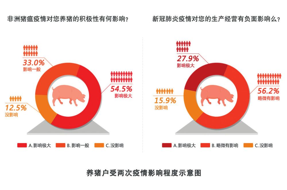 調(diào)查顯示,54.5%的養(yǎng)豬戶認(rèn)為非洲豬瘟疫情對(duì)養(yǎng)豬的積極性影響極大,防護(hù)成本高、造成虧損、仔豬成本高,是養(yǎng)豬戶反映非洲豬瘟疫情帶來的最強(qiáng)烈影響,27.9%的養(yǎng)豬戶認(rèn)為新冠肺炎疫情對(duì)生產(chǎn)經(jīng)營的負(fù)面影響極大。(見圖1)