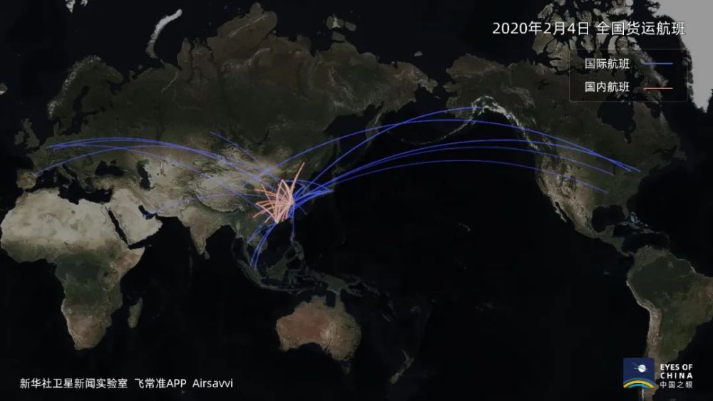 1個月內(nèi),中國國內(nèi)和直飛世界各地的貨運(yùn)航班快速增多,原有航線航班數(shù)也有增加,標(biāo)示航線的橘色、藍(lán)色線條也就更粗。