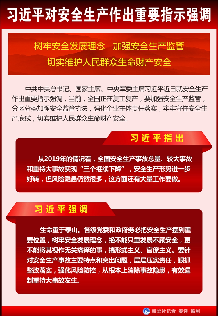 中共中央政治局常委、國務(wù)院總理李克強(qiáng)作出批示指出,當(dāng)前,全國正處于統(tǒng)籌推進(jìn)新冠肺炎疫情防控和復(fù)工復(fù)產(chǎn)的關(guān)鍵時期,安全生產(chǎn)意識和工作絲毫不能放松。各地區(qū)、各有關(guān)部門和各單位要堅持以習(xí)近平新時代中國特色社會主義思想為指導(dǎo),認(rèn)真貫徹落實黨中央、國務(wù)院決策部署,樹牢安全發(fā)展理念,層層壓實責(zé)任,深入排查各領(lǐng)域各環(huán)節(jié)安全生產(chǎn)隱患,全面開展安全生產(chǎn)專項整治三年行動,堅持系統(tǒng)治理、精準(zhǔn)施策,扎實推進(jìn)危險化學(xué)品、礦山、交通運輸、工業(yè)園、城市建設(shè)、危險廢物等重點領(lǐng)域安全整治,確保見到實效;加快建立健全安全生產(chǎn)責(zé)任和管理制度體系、隱患排查治理和風(fēng)險防控體系,加強(qiáng)監(jiān)管執(zhí)法和安全服務(wù),堅決遏制重特大事故發(fā)生,切實維護(hù)人民群眾生命財產(chǎn)安全。