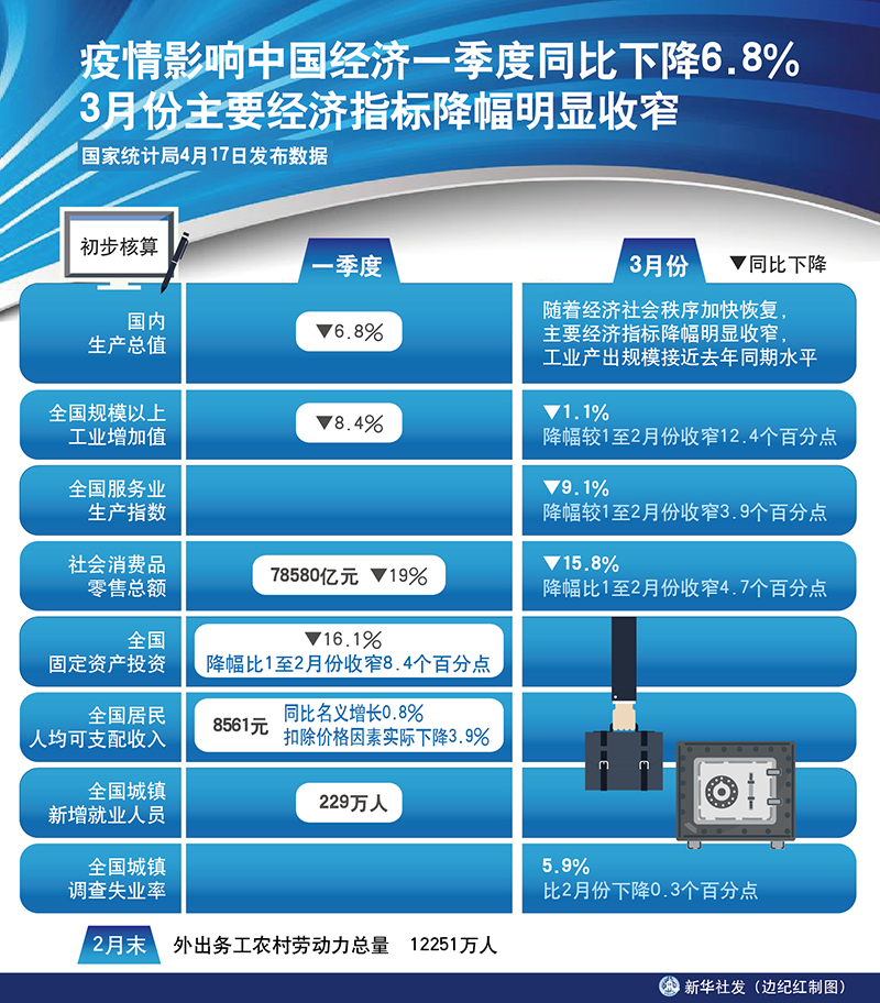 新華社北京4月17日電(記者陳煒偉、安蓓)國家統(tǒng)計局17日發(fā)布數(shù)據(jù),初步核算,一季度國內(nèi)生產(chǎn)總值同比下降6.8%。3月份,隨著經(jīng)濟社會秩序加快恢復(fù),主要經(jīng)濟指標(biāo)降幅明顯收窄,工業(yè)產(chǎn)出規(guī)模接近去年同期水平。