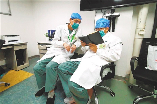 原慶(右)在醫(yī)生辦公室與同事交接班。余易安攝(中經(jīng)視覺(jué))