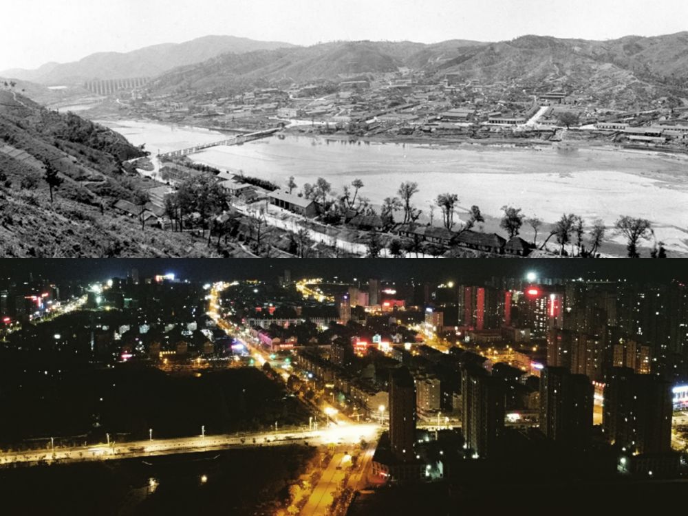 ?。ㄉ蠄D:1961年金寨縣城,新華社記者吳乙明、張幼良攝;下圖:2020年金寨縣城夜景。新華社記者陳諾攝)