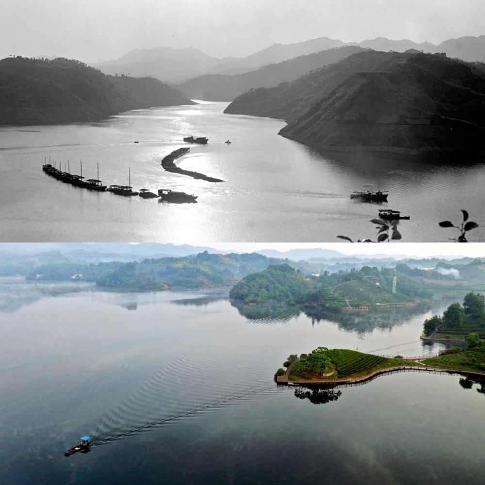 (上圖:1976年金寨的水庫,新華社記者成大林?jǐn)z;下圖:2019年水庫之上是茶谷。新華社記者陶明攝)
