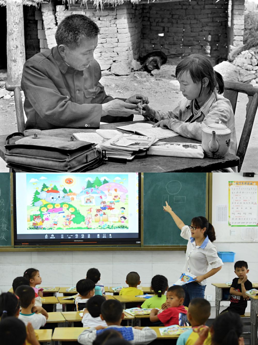 ?。ㄉ蠄D:1991年5月,金寨縣希望小學(xué)老師胡遵訓(xùn)跑20多里山路為學(xué)生胡亞麗補(bǔ)課,新華社記者張曙光攝;下圖:2019年9月3日,金寨縣希望小學(xué)南校區(qū)學(xué)生通過多媒體上課。新華社記者劉軍喜攝)