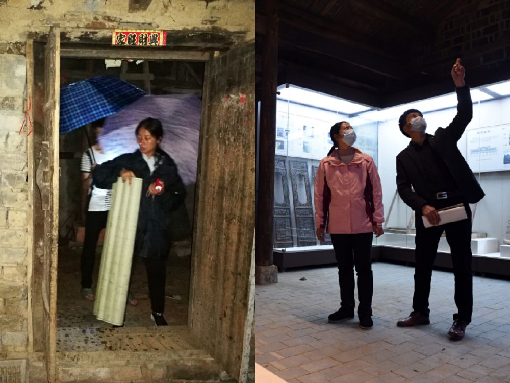 (左圖:2017年7月的一場大暴雨中,大灣村第一書記余靜轉(zhuǎn)移危房中群眾,新華社記者陳諾攝;右圖:2020年3月19日,大灣村在建農(nóng)俗博物館內(nèi),余靜(左)和施工人員交流。新華社發(fā)周牧攝)