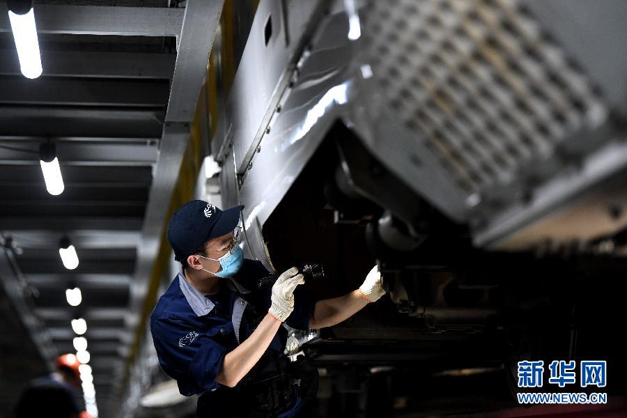 4月29日夜,合肥南動(dòng)車運(yùn)用所的工作人員對(duì)動(dòng)車組進(jìn)行檢修。新華社記者劉軍喜攝