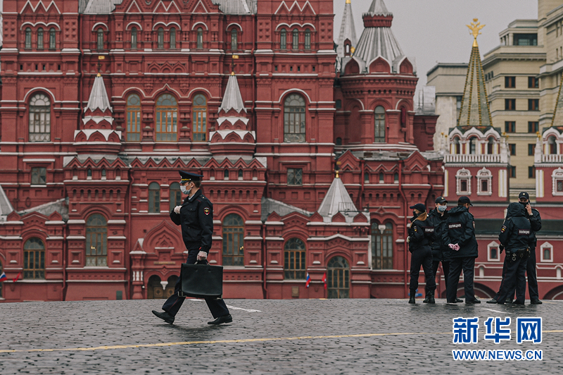 5月4日,一名警察(左)經(jīng)過俄羅斯莫斯科紅場。 為遏制新冠疫情蔓延,3月30日起莫斯科和俄多城實施居家隔離制度。 新華社發(fā)(葉甫蓋尼·西尼岑攝)