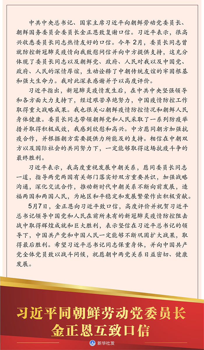 5月7日,金正恩向習(xí)近平致口信,高度評(píng)價(jià)并祝賀習(xí)近平總書記領(lǐng)導(dǎo)中國(guó)黨和人民在前所未有的新冠肺炎疫情防控阻擊戰(zhàn)中取得輝煌成就和巨大勝利,表示堅(jiān)信在習(xí)近平總書記的領(lǐng)導(dǎo)下,中國(guó)共產(chǎn)黨和中國(guó)人民一定能夠不斷鞏固擴(kuò)大戰(zhàn)果,取得最后勝利。希望習(xí)近平總書記同志保重身體,并向中國(guó)共產(chǎn)黨全體黨員致以戰(zhàn)斗問候,祝愿朝中兩黨關(guān)系日益密切、健康發(fā)展。