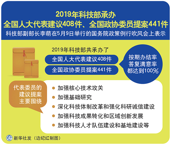 2019年科技部承辦全國人大代表建議408件、全國政協(xié)委員提案441件
