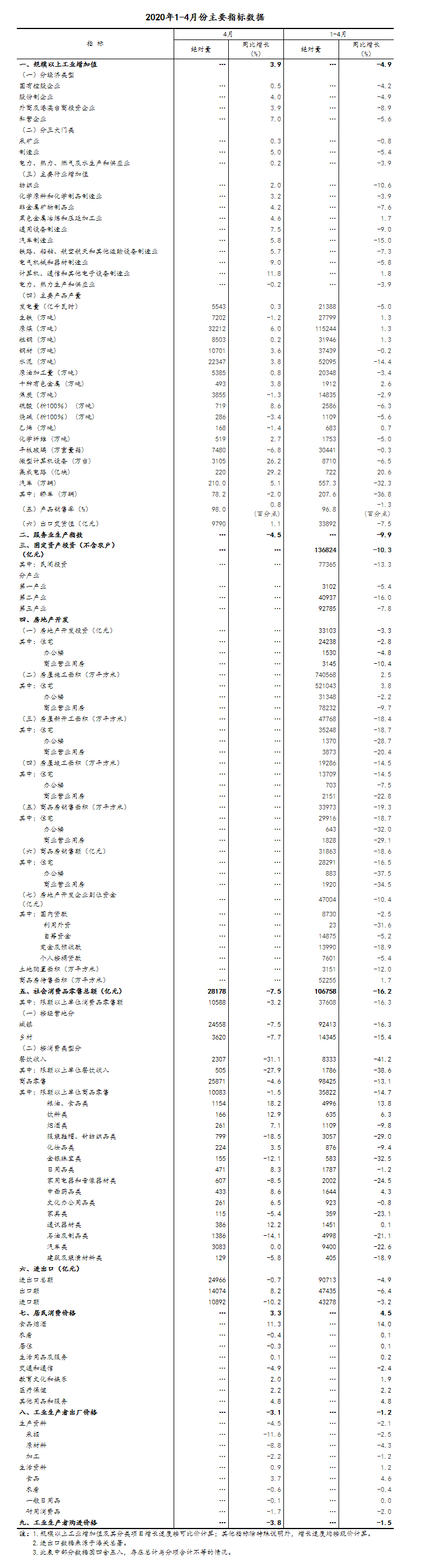 4月份,全國規(guī)模以上工業(yè)增加值同比增長3.9%,3月份為下降1.1%;環(huán)比增長2.27%。1-4月份,全國規(guī)模以上工業(yè)增加值同比下降4.9%,降幅比1-3月份收窄3.5個百分點。4月份,分經(jīng)濟(jì)類型看,國有控股企業(yè)增加值增長0.5%;股份制企業(yè)增長4.0%,外商及港澳臺商投資企業(yè)增長3.9%;私營企業(yè)增長7.0%。分三大門類看,采礦業(yè)增加值增長0.3%;制造業(yè)增長5.0%,3月份為下降1.8%;電力、熱力、燃?xì)饧八a(chǎn)和供應(yīng)業(yè)增長0.2%。高技術(shù)制造業(yè)和裝備制造業(yè)增長較快。4月份,高技術(shù)制造業(yè)和裝備制造業(yè)增加值分別增長10.5%和9.3%,快于規(guī)模以上工業(yè)6.6和5.4個百分點。從產(chǎn)品產(chǎn)量看,光纜,挖掘、鏟土運輸機械,集成電路,工業(yè)機器人,微型計算機設(shè)備產(chǎn)量同比分別增長43.8%、40.8%、29.2%、26.6%、26.2%。