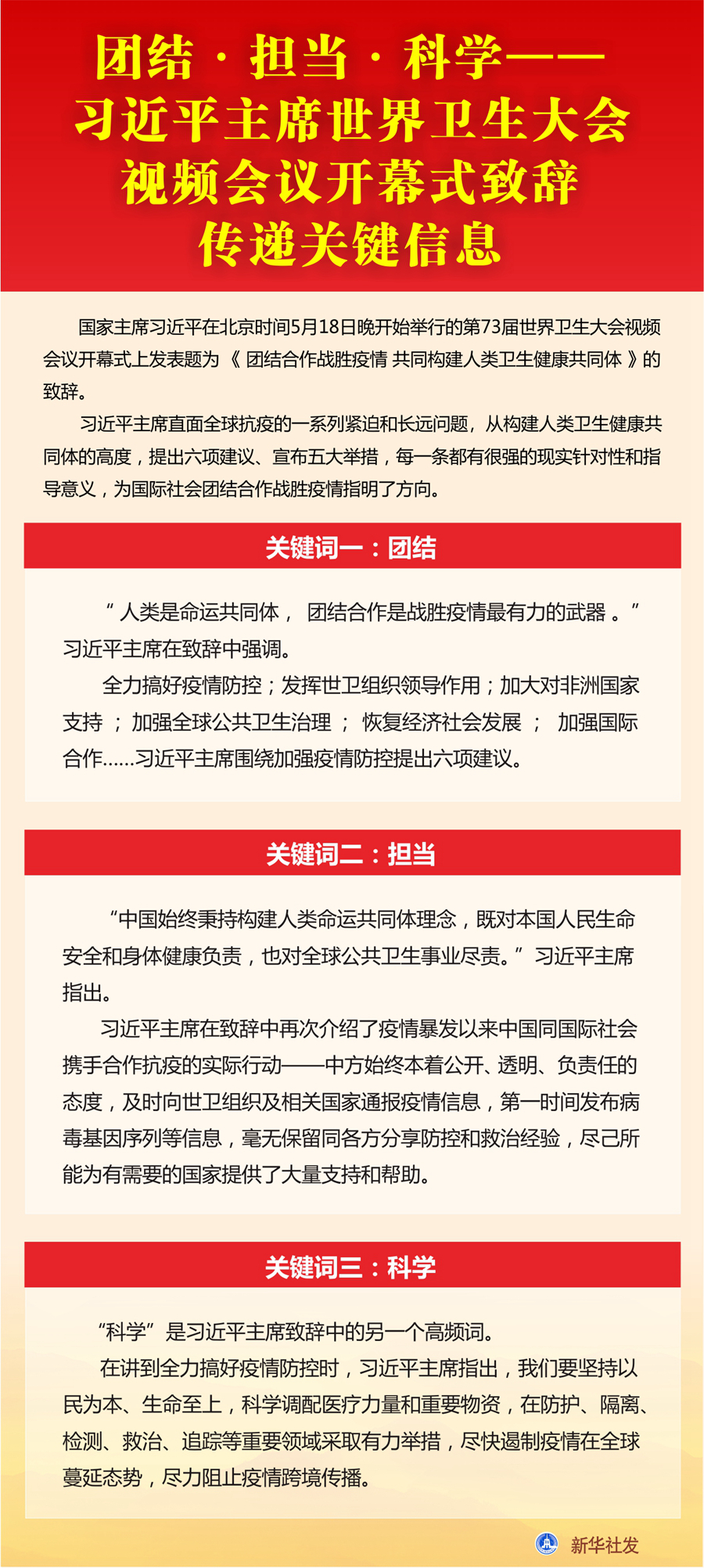 新華社北京5月18日電? 綜合新華社駐外記者報道:國家主席習近平18日晚在第73屆世界衛(wèi)生大會視頻會議開幕式上發(fā)表題為《團結(jié)合作戰(zhàn)勝疫情 共同構(gòu)建人類衛(wèi)生健康共同體》的致辭。世界衛(wèi)生組織官員及多國人士認為,習近平主席在致辭中提出的加強疫情防控六項建議、中國為推進全球抗疫合作的五大舉措秉持構(gòu)建人類命運共同體理念,體現(xiàn)了中國負責任大國擔當,對推動抗擊疫情國際合作具有重要意義。