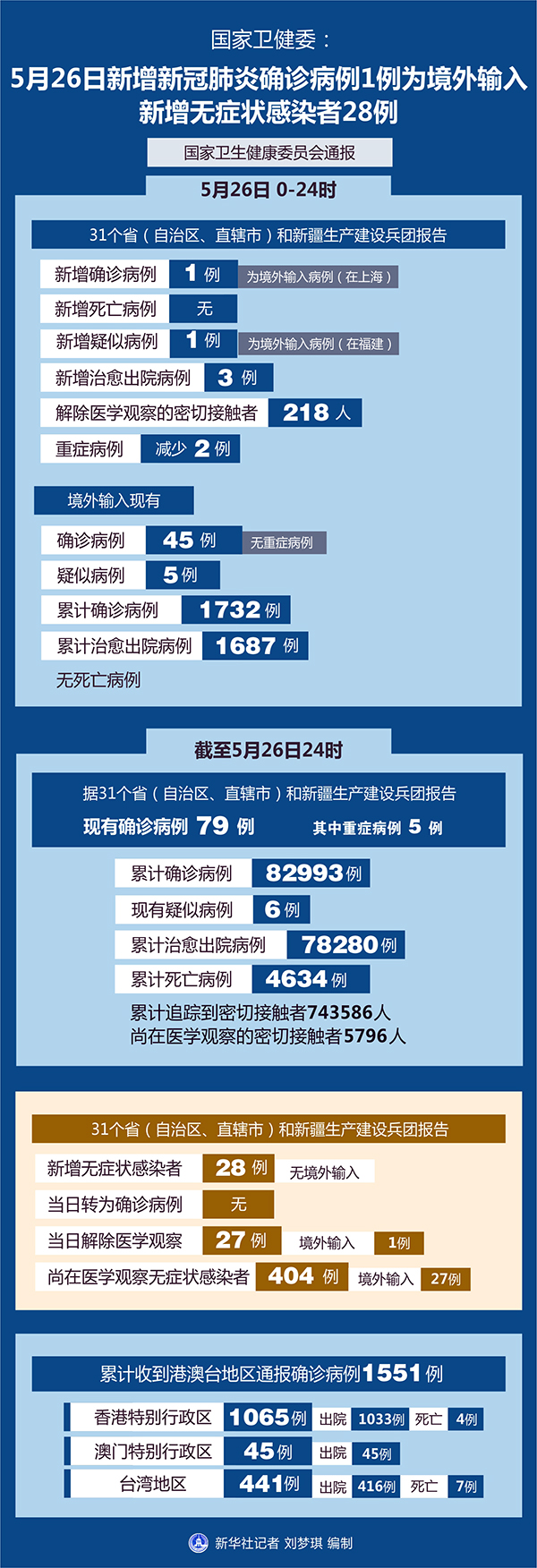 截至5月26日24時(shí),據(jù)31個(gè)省(自治區(qū)、直轄市)和新疆生產(chǎn)建設(shè)兵團(tuán)報(bào)告,現(xiàn)有確診病例79例(其中重癥病例5例),累計(jì)治愈出院病例78280例,累計(jì)死亡病例4634例,累計(jì)報(bào)告確診病例82993例,現(xiàn)有疑似病例6例。累計(jì)追蹤到密切接觸者743586人,尚在醫(yī)學(xué)觀察的密切接觸者5796人。