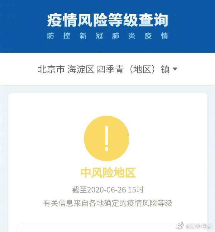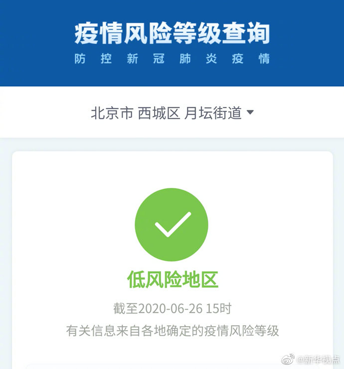 根據國務院客戶端小程序“疫情風險等級查詢”,截至6月26日15時,北京市西城區(qū)月壇街道由中風險地區(qū)變更為低風險地區(qū)。海淀區(qū)四季青(地區(qū))鎮(zhèn)、昌平區(qū)回龍觀街道升級為中風險地區(qū)。