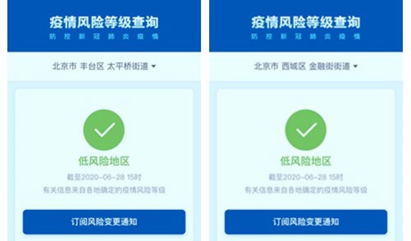 記者從國務(wù)院客戶端小程序“疫情風(fēng)險(xiǎn)等級查詢”上了解到,截至6月28日15時(shí),北京市西城區(qū)金融街街道、豐臺區(qū)太平橋街道由疫情中風(fēng)險(xiǎn)地區(qū)變更為低風(fēng)險(xiǎn)地區(qū)。