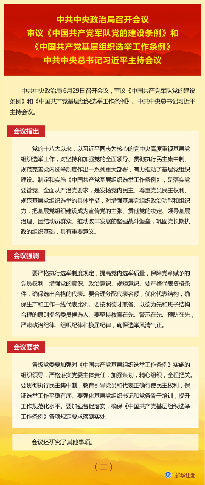 新華社北京6月29日電? 中共中央政治局6月29日召開(kāi)會(huì)議,審議《中國(guó)共產(chǎn)黨軍隊(duì)黨的建設(shè)條例》和《中國(guó)共產(chǎn)黨基層組織選舉工作條例》。中共中央總書(shū)記習(xí)近平主持會(huì)議。