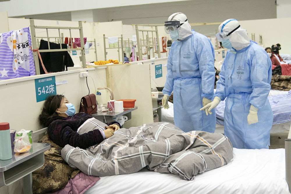 武漢客廳方艙醫(yī)院醫(yī)護(hù)人員在詢問(wèn)患者病情(新華社記者熊琦攝)