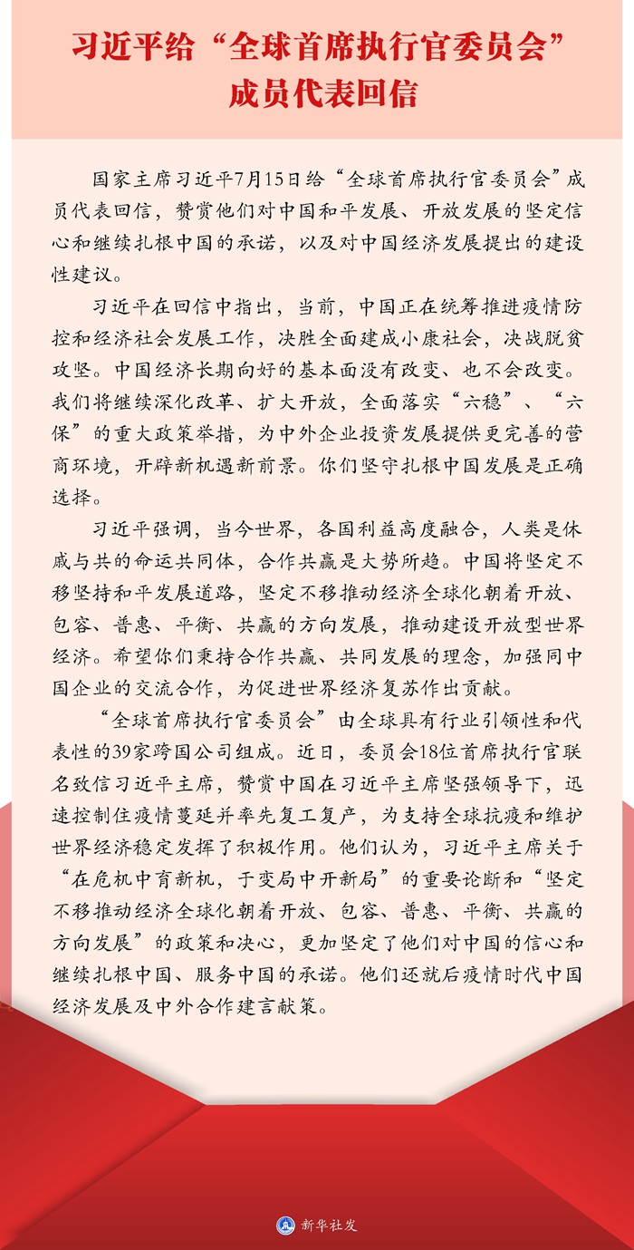 新華社北京7月16日電 國家主席習(xí)近平7月15日給“全球首席執(zhí)行官委員會”成員代表回信,贊賞他們對中國和平發(fā)展、開放發(fā)展的堅定信心和繼續(xù)扎根中國的承諾,以及對中國經(jīng)濟發(fā)展提出的建設(shè)性建議。