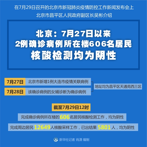 新華社北京7月29日電(記者陳旭)在29日召開的北京市新冠肺炎疫情防控工作新聞發(fā)布會上,北京市昌平區(qū)人民政府副區(qū)長吳彬介紹,27日以來2例大連市疫情關(guān)聯(lián)確診病例所在樓606名居民核酸檢測工作已完成,均為陰性。周邊居民12649人核酸采樣工作已出結(jié)果5801人,均為陰性。
