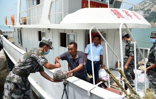 7月16日,“泰叔”錢(qián)均堂(左二)在“擁軍船”靠岸蘇山島后搬運(yùn)送給部隊(duì)官兵的慰問(wèn)品。新華社記者 王凱 攝