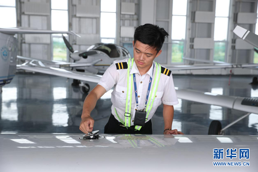 圖為8月6日,內(nèi)蒙古飛行學院飛行學員在起飛前檢查航油情況。新華網(wǎng)記者焦鵬 攝