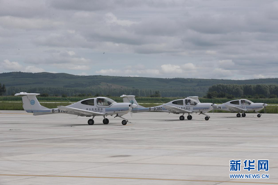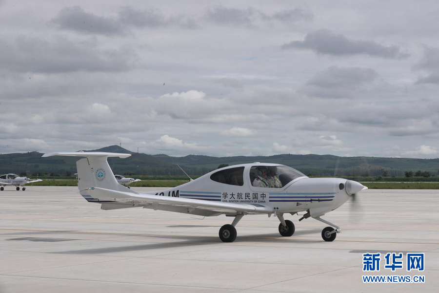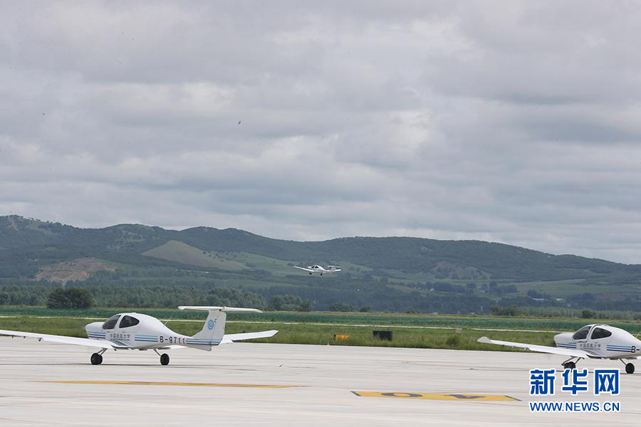 圖為飛行學員駕駛訓練機從扎蘭屯成吉思汗機場起飛。新華網(wǎng)記者焦鵬 攝