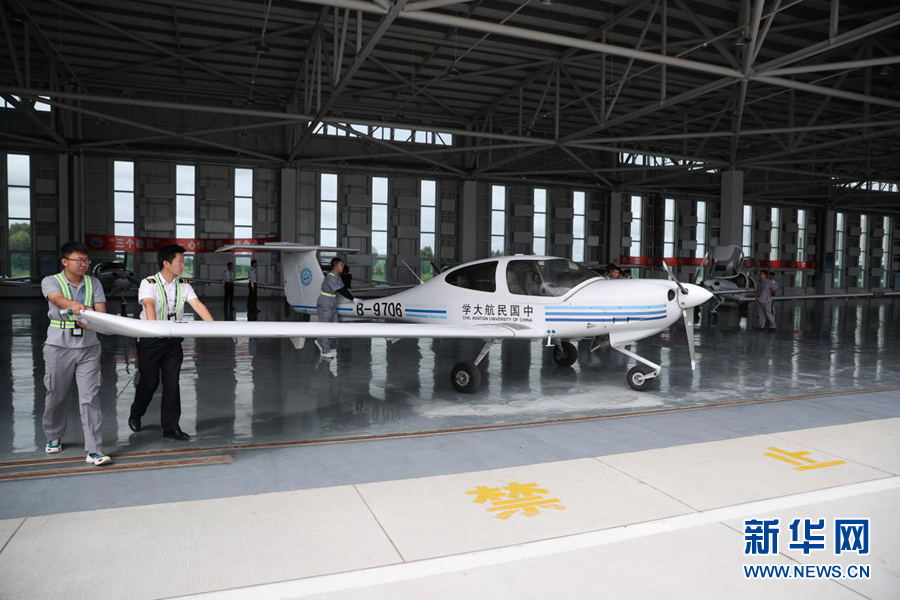圖為中國民航大學內(nèi)蒙古飛行學院機庫中待飛的單發(fā)DA40D飛機。新華網(wǎng)記者焦鵬 攝