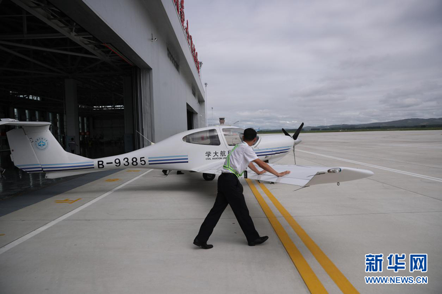 圖為訓練飛行前飛行學員將訓練機推出機庫。新華網(wǎng)記者焦鵬 攝
