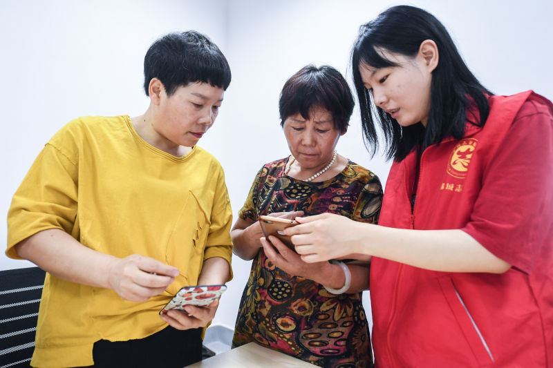 6月4日,在杭州市臨安區(qū)錦城街道勝利社區(qū),青年社工指導(dǎo)老人們用手機(jī)購(gòu)物 徐昱/攝