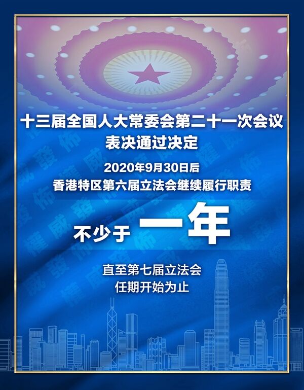 第十三屆全國人民代表大會常務(wù)委員會第二十一次會議審議了《國務(wù)院關(guān)于提請全國人民代表大會常務(wù)委員會就香港特別行政區(qū)第六屆立法會繼續(xù)運(yùn)作作出決定的議案》。上述議案是應(yīng)香港特別行政區(qū)行政長官向中央人民政府報(bào)送的有關(guān)報(bào)告提出的。香港特別行政區(qū)行政長官會同行政會議因應(yīng)當(dāng)?shù)匦鹿诜窝滓咔榈膰?yán)峻形勢已決定將香港特別行政區(qū)第七屆立法會選舉推遲一年,在此情況下香港特別行政區(qū)立法機(jī)關(guān)將出現(xiàn)空缺。為維護(hù)香港特別行政區(qū)憲制秩序和法治秩序,確保香港特別行政區(qū)政府正常施政和社會正常運(yùn)行,根據(jù)《中華人民共和國憲法》和《中華人民共和國香港特別行政區(qū)基本法》的有關(guān)規(guī)定,全國人民代表大會常務(wù)委員會作出如下決定: