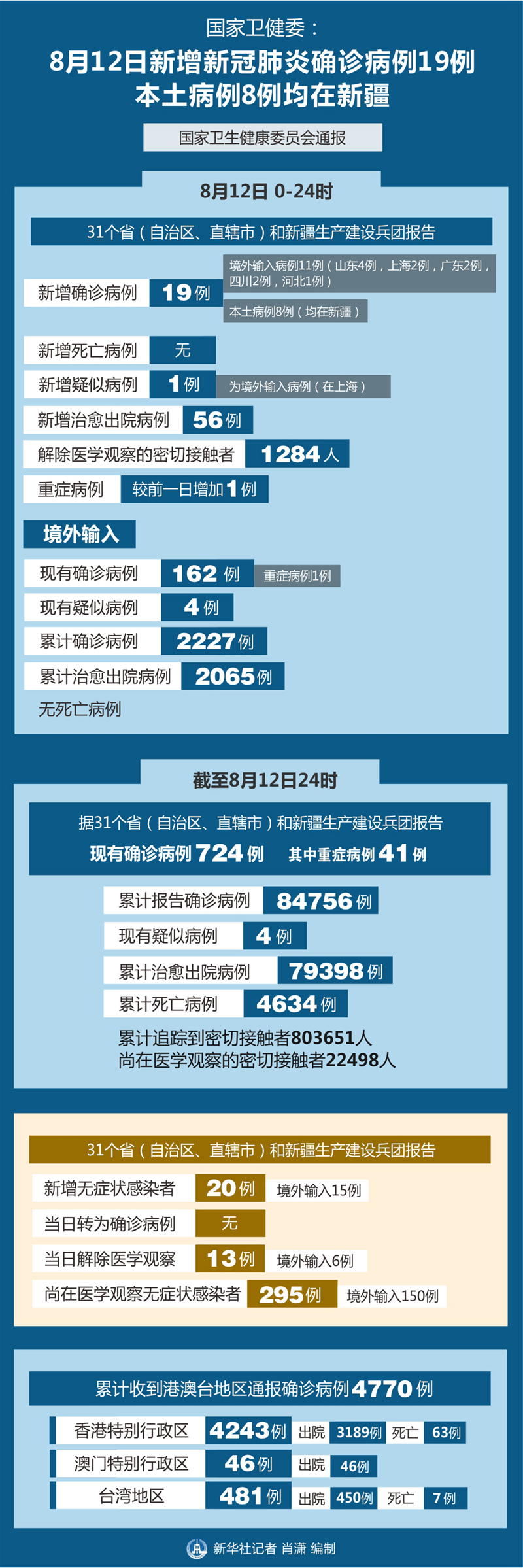 截至8月12日24時(shí),據(jù)31個(gè)?。ㄗ灾螀^(qū)、直轄市)和新疆生產(chǎn)建設(shè)兵團(tuán)報(bào)告,現(xiàn)有確診病例724例(其中重癥病例41例),累計(jì)治愈出院病例79398例,累計(jì)死亡病例4634例,累計(jì)報(bào)告確診病例84756例,現(xiàn)有疑似病例4例。累計(jì)追蹤到密切接觸者803651人,尚在醫(yī)學(xué)觀察的密切接觸者22498人。