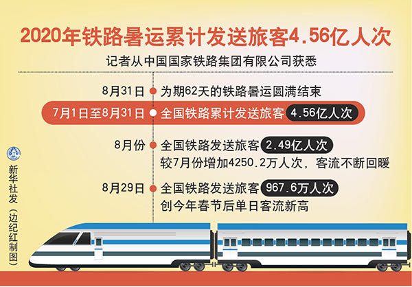 新華社北京9月1日電(記者樊曦)記者從中國國家鐵路集團(tuán)有限公司獲悉,8月31日,為期62天的鐵路暑運(yùn)圓滿結(jié)束。7月1日至8月31日,全國鐵路累計發(fā)送旅客4.56億人次。
