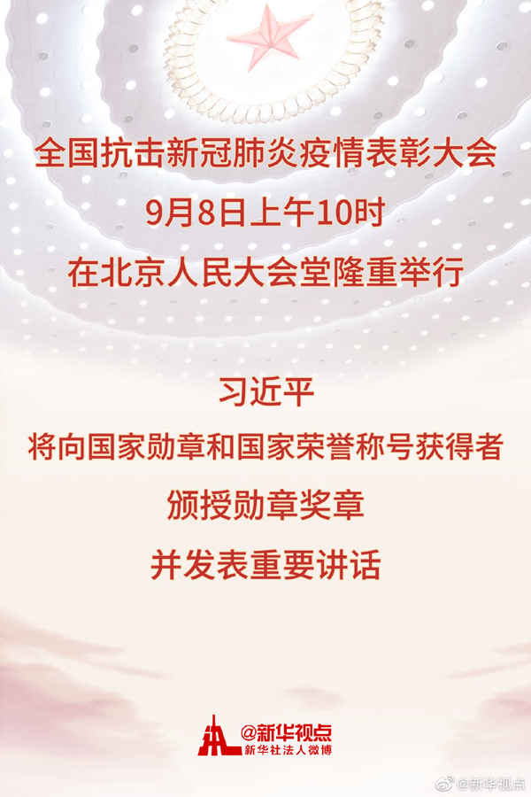 新華社北京9月6日電? 全國(guó)抗擊新冠肺炎疫情表彰大會(huì)將于9月8日上午10時(shí)在北京人民大會(huì)堂隆重舉行。中共中央總書(shū)記、國(guó)家主席、中央軍委主席習(xí)近平將向國(guó)家勛章和國(guó)家榮譽(yù)稱(chēng)號(hào)獲得者頒授勛章獎(jiǎng)?wù)虏l(fā)表重要講話。