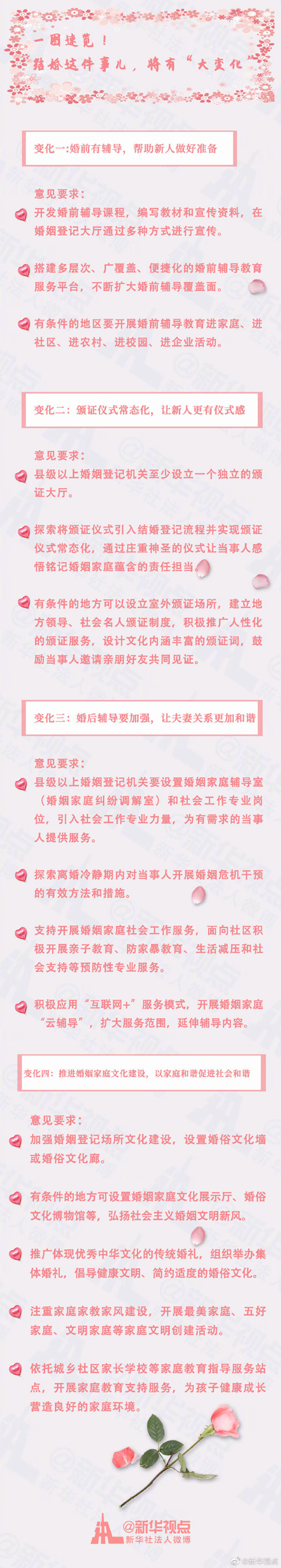 婚姻是家庭的紐帶,婚姻家庭和諧事關(guān)民生幸福和社會(huì)穩(wěn)定。意見(jiàn)要求,要探索開展婚前輔導(dǎo),開發(fā)婚前輔導(dǎo)課程,編寫教材和宣傳資料,在婚姻登記大廳通過(guò)宣傳欄、視頻、免費(fèi)贈(zèng)閱等方式進(jìn)行宣傳,幫助當(dāng)事人做好進(jìn)入婚姻狀態(tài)的準(zhǔn)備,學(xué)會(huì)管理婚姻,努力從源頭上減少婚姻家庭糾紛的產(chǎn)生。