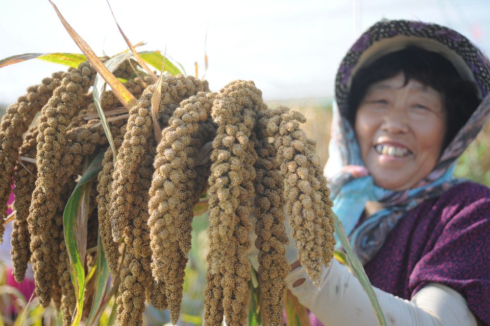 9月22日,山東省煙臺(tái)市福山區(qū)老官莊村農(nóng)民展示剛剛收獲的無(wú)公害谷子。新華社發(fā)(申吉忠 攝)