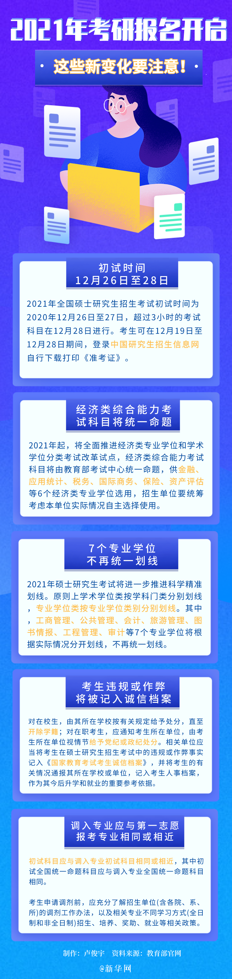 ??? 10月10日起至10月31日,全國(guó)碩士研究生招生考試開始正式報(bào)名,每天9:00-22:00,考生可登錄網(wǎng)上報(bào)名平臺(tái)填報(bào)報(bào)名信息。2021年研究生招生考試在考試命題、調(diào)劑、專業(yè)劃線等方面都有所調(diào)整,一圖帶你速覽這些方面的變化。
